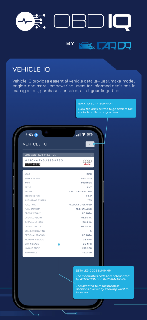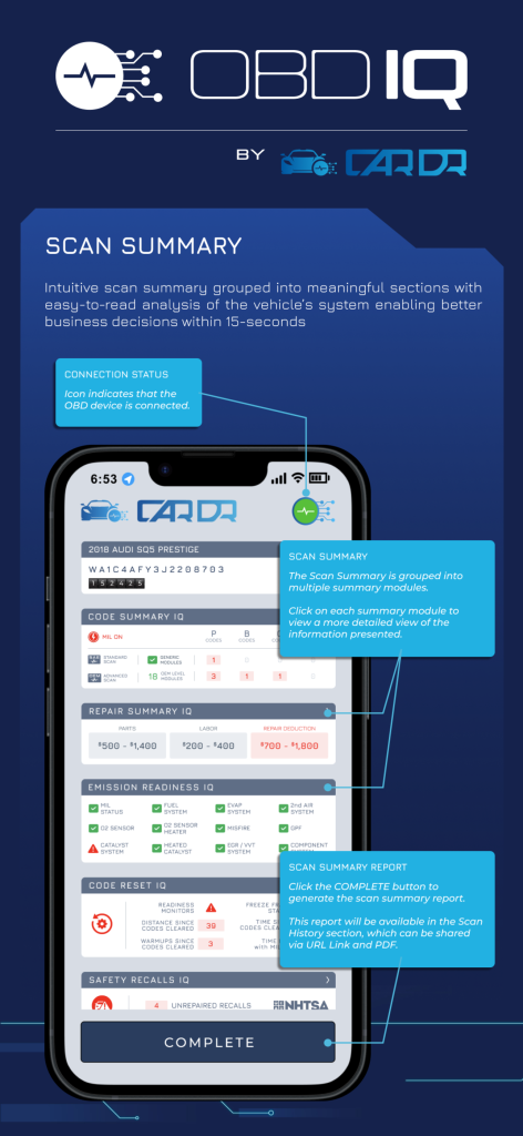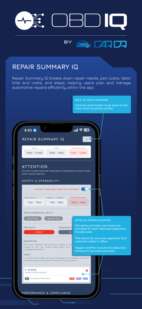 Repair Summary IQ integrates seamlessly with your vehicle’s diagnostics to ensure that you are well-informed when planning repairs, whether for maintaining your vehicle’s optimal condition or preparing for a sale.